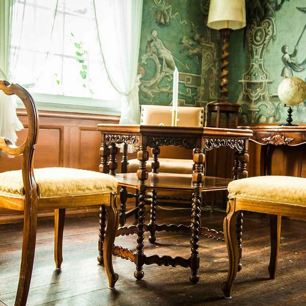 De landlige scenene på veggene viser et landskap fra Holland med store trær, møller, småbåter, bønder og landsbyliv.
